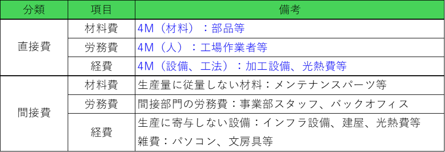 前回迄での4Mのコスト指標について、下表をもとに説明してきました。今回は、コスト指標で最後になる製品に対して、深堀していきたいとと思います。