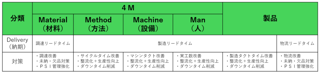 | 製造リードタイム | 部品受入れ~出荷迄の工程にかかる時間 |