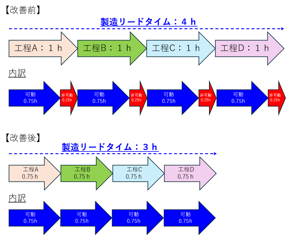 基本的には、下記のような関係になりますが、リードタイム短縮というと、下記のそれぞれの時間を少しでも少なくするために、改善活動を行います。