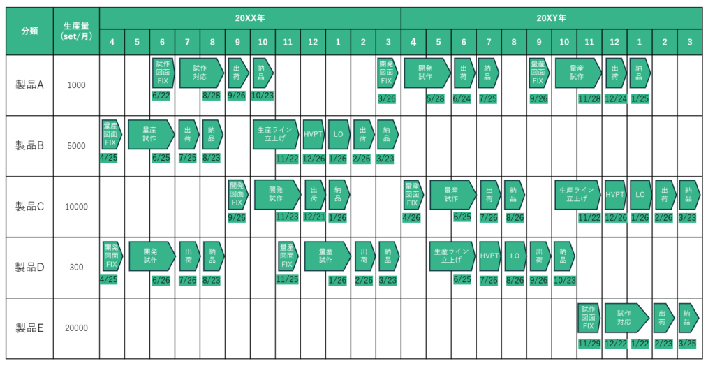 - 大日程:各製品の開発~出荷迄の横断的な日程