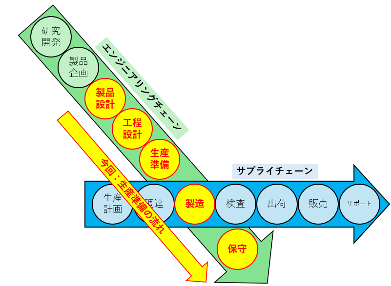 【導入編】第2回 生産技術の役割にて生産準備は、エンジニアリングチェーンの一部であることを説明しました。生産技術がかかわるエンジニアリングチェーンの業務は、大きくは、①製品設計、②工程設計、③生産準備、④製造、⑤保守の順にフェーズが進みます。その中で下表のようなフェーズの役割、各部門の動きがあります。細かくは、次で説明します。